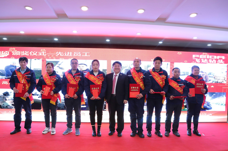 飞达钻头总经理郭和平为高文秀等25名先进个人以及营销中心蔡波团队等五个最佳团队颁奖。